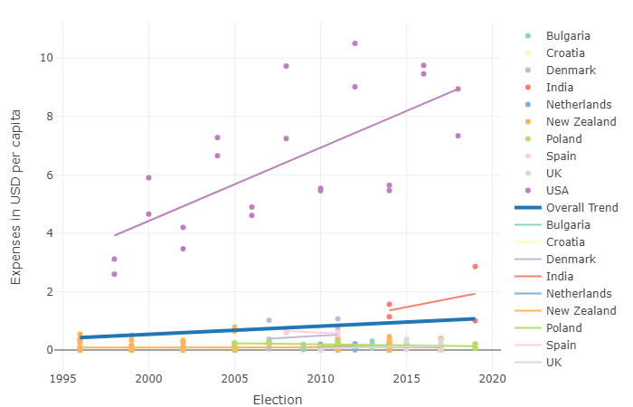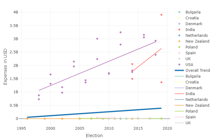 Interestingly, whilst USA and India saw huge increases in election spending over time, this trend is not so apparent in Europe. In many European nations, election costs are much more stagnant and in some countries like Poland, elections got cheaper.