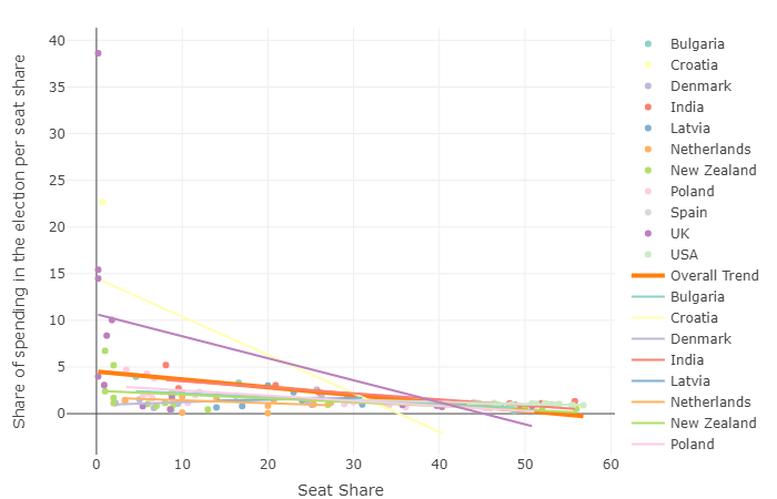 One interesting thing the graph shows us is that parties in Denmark and Netherlands show relatively steep gradients compared to countries such as USA and Bulgaria. This means increases in shares of seats and votes, as share of spending increases are more pronounced in Denmark and Netherlands. The peculiar difference here is that former two nations have multi-party systems, whereas the latter two focus on the two major parties.