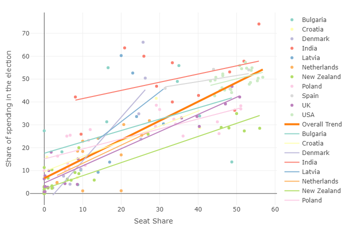 I created the two graphs shown above. One graph compares election spending to seat share gained by the party, the second graph compares spending to vote share acquired by the party in a given election. It is important to look at both graphs here, as electoral systems differ between countries. Not every country implements proportional representation.