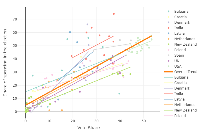 So, first and foremost, we can clearly see a clear trend both in terms of seats, as well as votes. It is apparent that overall, the higher share of spending results in attaining a higher share of votes. This trend right there explains why parties spend so much effort and money to run election campaigns. There doesn’t seem to be many drastic differences in the graphs in terms of seat share and vote share. This is interesting, because it implies that this relationship tends to hold true regardless of quirks of differing electoral systems.